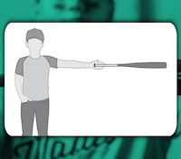 1. Place the bottom of the bat in the center of your chest, pointing it to the side, parallel to your outstretched arm. If you can comfortably reach the top of the bat with your fingertips, the bat is the right length. | 2. Position the bottom of the bat in the center of your chest, facing outward. If your arm can reach out and grab the barrel of the bat, then it is the correct length. | 3. Stand the bat up against the side of your leg. If the end of the bat reaches the center of your palm when you reach down, it’s the appropriate length. |